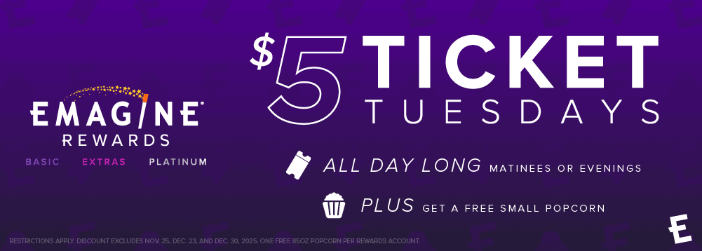 Join us every Tuesday for $5.00 Ticket Tuesdays. Whether it’s a matinee or evening show, Emagine Rewards members get tickets for only $5.00*.